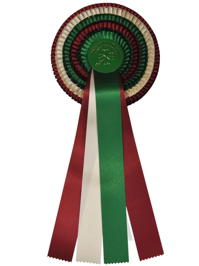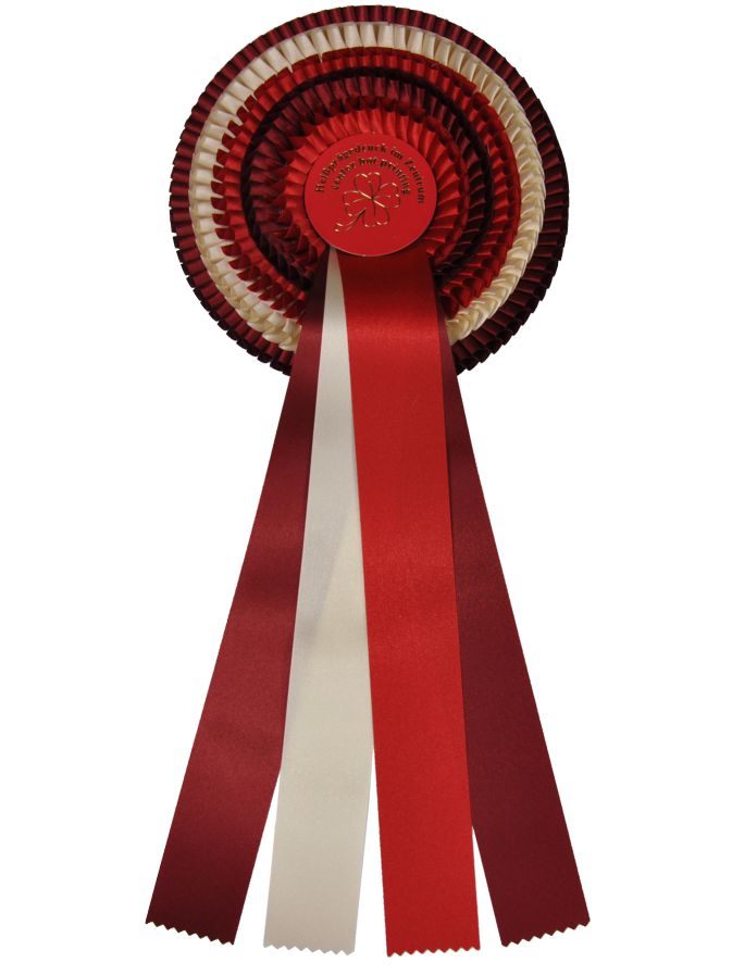 Große fünffach Rosette mit vier Bändern. Eine Turnierschleife zu einem hervorragenden Preis-Leistungsverhätnis.